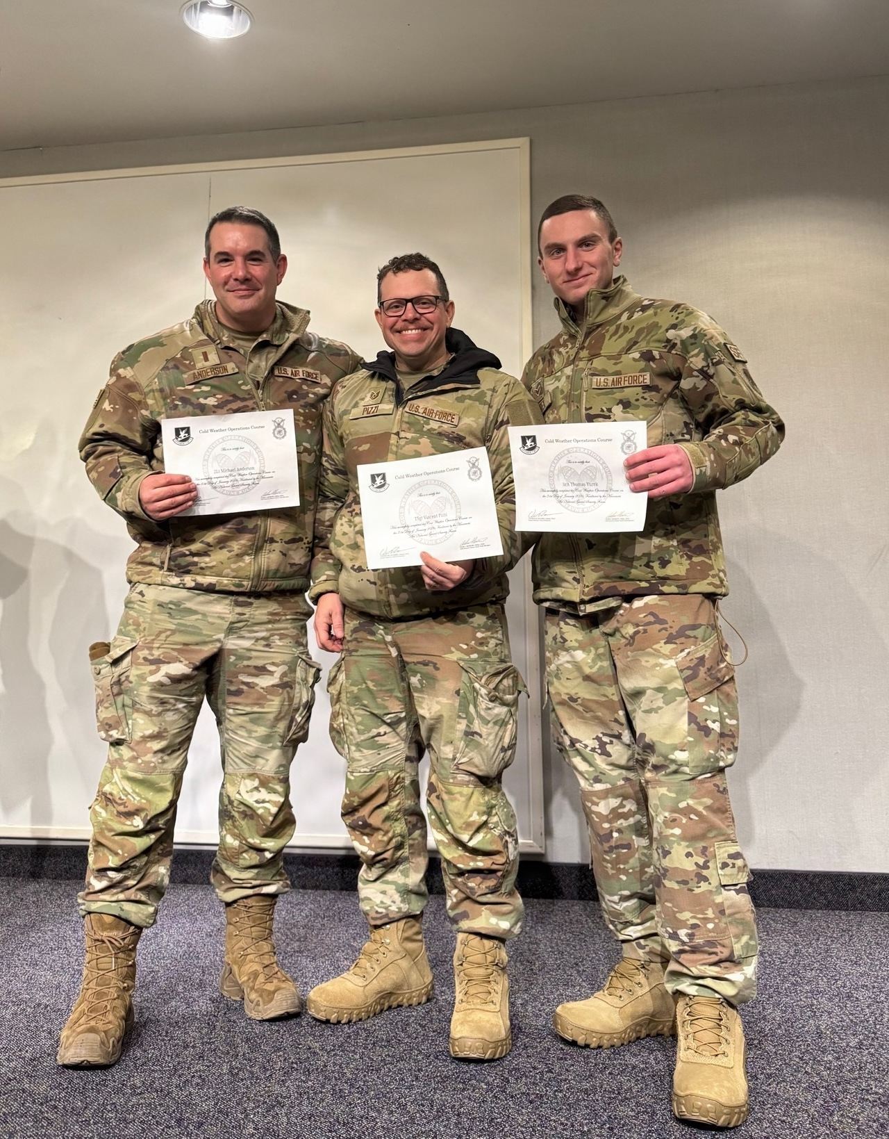 U.S. Air Force Col. Andrew St. Jean, commander of the 102nd Intelligence Wing, left, and U.S. Air Force Command Chief Master Sgt. Shane McGuire, right, present the 102nd IW Airman of the Year award to U.S. Air Force Senior Airman Matthew Wright, a cyber intelligence analyst with the 267th Intelligence Squadron, during a ceremony on Joint Base Cape Cod, Massachusetts, Feb. 6, 2026. For Wright, winning this award reinforced that his work in intelligence matters and gave him purpose in the mission, which he attributes to the people he interacts with daily, his leadership, mentors, and fellow Airmen. (Air National Guard photo by Senior Airman Julia Ahaesy)